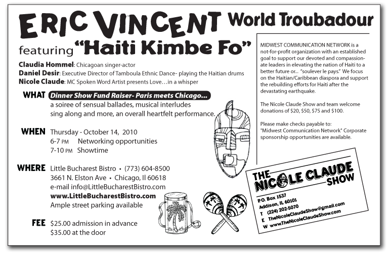 Eric Vincent featuring: "Haiti Kimbe Fo" Claudia Hommel: Chicagoan singer-actor Daniel Desir: Executive Director of Tamboula Ethnic Dance- playing the Haitian drums Nicole Claude: MC Spoken Word Artist presents Love…in a whisper WHAT: Dinner Show Fund Raiser- Paris meets Chicago... a soiree of sensual ballades, musical interludes sing along and more, an overall heartfelt performance. WHEN: 6-7 PM Networking opportunities 7-10 PM Showtime WHERE: Little Bucharest Bistro • (773) 604-8500 3661 N. Elston Ave • Chicago, Il 60618 e-mail info@LittleBucharestBistro.com LittleBucharestBistro.com Ample street parking available $25.00 admission in advance $35.00 at the door MIDWEST COMMUNICATION NETWORK is a not-for-profit organization with an established goal to support our devoted and compassionate leaders in elevating the nation of Haiti to a better future or... “soulever le pays.” We focus on the Haitian/Caribbean diaspora and support the rebuilding efforts for Haiti after the devastating earthquake. The Nicole Claude Show and team welcome donations of $20, $50, $75 and $100. Please make checks payable to: "Midwest Communication Network" Corporate sponsorship opportunities are available.